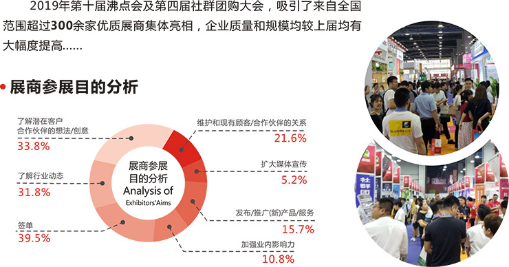 会+展总览 随着《中华人民共和国电子商务法》的出台和实施,中国新零售市场正处于蓬勃发展阶段,预计今后的数年仍将保持上扬趋势;社群团购、微商、社交电商成为中国新零售渠道占领市场的重要因素之一。在这一大趋势下,第四届社群团购大会与第十届沸点会首度以【会+展】模式在2019年达到了空前规模,于2019年8月8日-9日在广州国际采购中心召开,深度链接沸点天下五年来沉淀的全方位资源。从平台品牌系统、供应链系统、运营系统衍生社群团购基本逻辑,串联成一完整的社群团购产业链年度盛会。