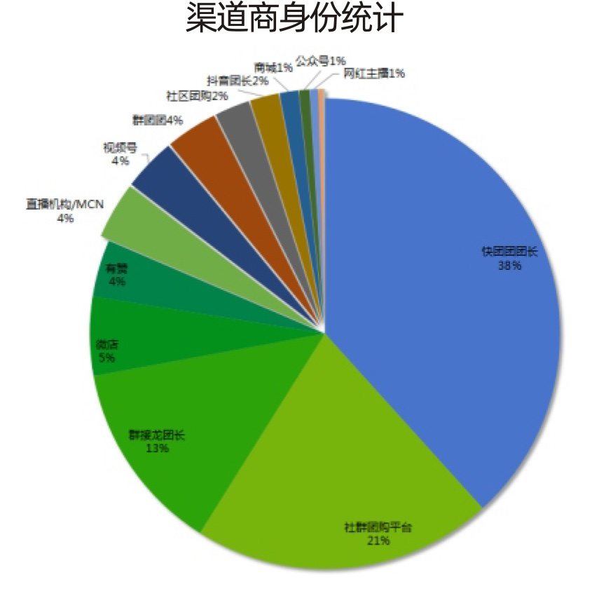 快团团团长38.3%;社群团购平台20.61%;群接龙团长13.20%;微店13.20%;有赞(群团团团长未包含在内)3.92%