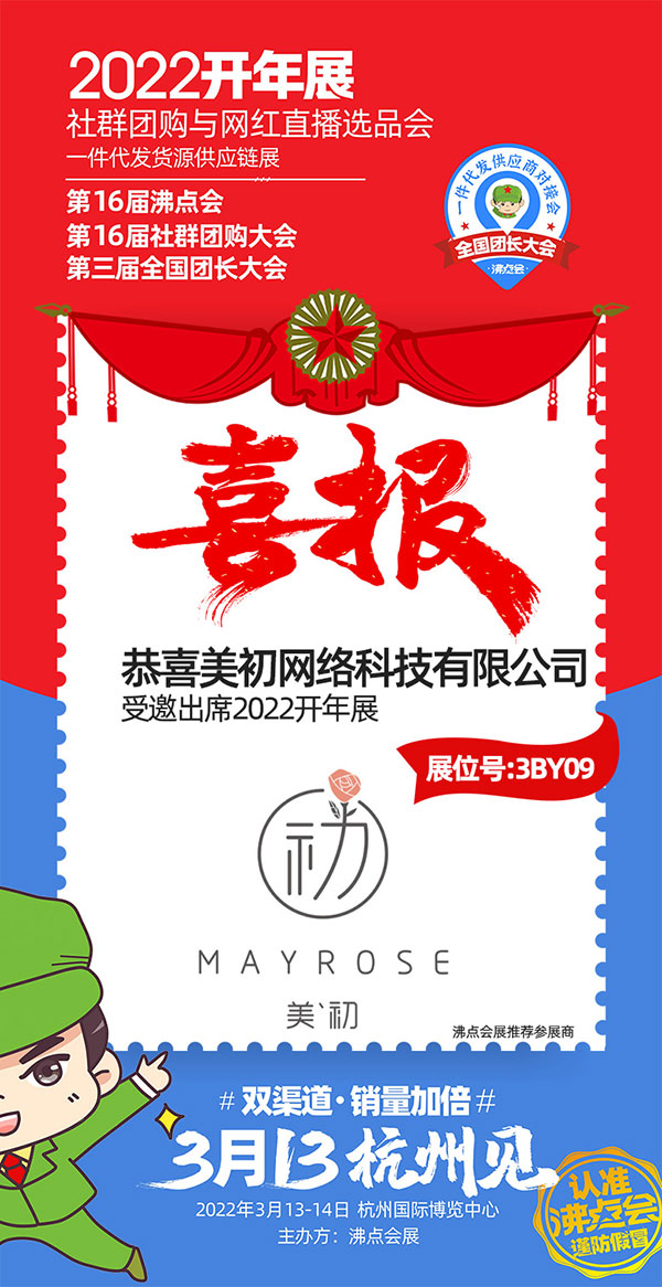 由沸点会展主办的2022开年展将于3月13-14日在杭州国际博览中心隆重举办,聚焦双渠道、销量增长加倍。此次活动一次可以链接上美食、美妆、母婴、零食、服装、百货、小家电、特产生鲜等各类适合社群团购和直播电商的一件代发一手货源。届时,郑州美初网络科技有限公司受邀参展2022开年展。