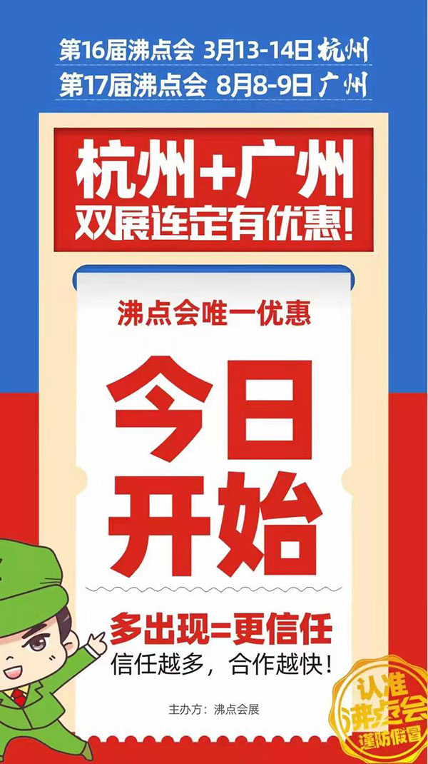 沸点会的展位一直是统一价格销售,这次也是针对两展连定的客户,推出了限时的优惠政策,这个政策只是到1月15号为止,欢迎新老朋友抓紧时间预定!!