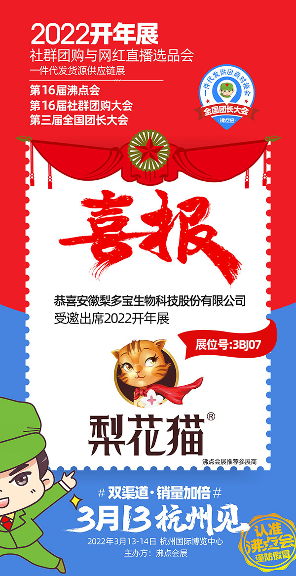 2022年3月13-14日在杭州国际博览中心,2022杭州团长大会将在次举办。此次活动将汇集全国优秀的具备一件代发货源的供应商集中展示,供各大平台和团长选品对接。届时,安徽梨多宝生物科技股份有限公司旗下品牌“梨花猫”也将受邀参展。