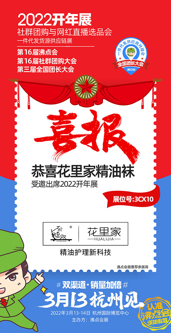 2022年3月13-14日,在杭州国际博览中心隆重举办的2022杭州团长大会分为3大馆,6大展区,目前正在进行展位招募,参展商和平台方都在踊跃报名中,如此盛典,杭州艺群科技有限公司旗下产品“花里家精油袜”受邀参展本次展会。