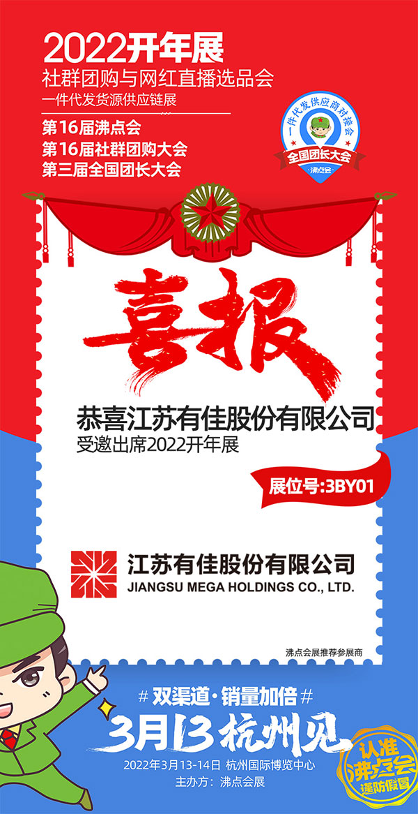 由沸点会展主办的2022开年展定于2022年3月13-14日在杭州国际博览中心举办,此次活动展位面积30000平米,展商数量800+,新品爆品10000+,渠道方1000+,行业观众10000+。如此盛典,江苏有佳股份有限公司受邀参展!