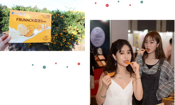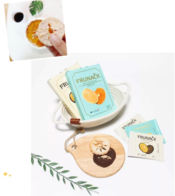 FRUNACK其特点是使用企业独有的“远红外复合干燥设备”大幅提升了目前水果干产品的不足之处。不仅仅是添加物0%的无任何添加的纯天然,而且是采用零添加、非冷冻的济州特殊的地理纬度特产并盛产的天然水果,使得原有水果的色香味和营养元素几乎没有损失的最大程度达到99%的保留了下来,甜度几乎达到100%保留住,大概100克的柑橘仅能制作出10克的橘子片产品。