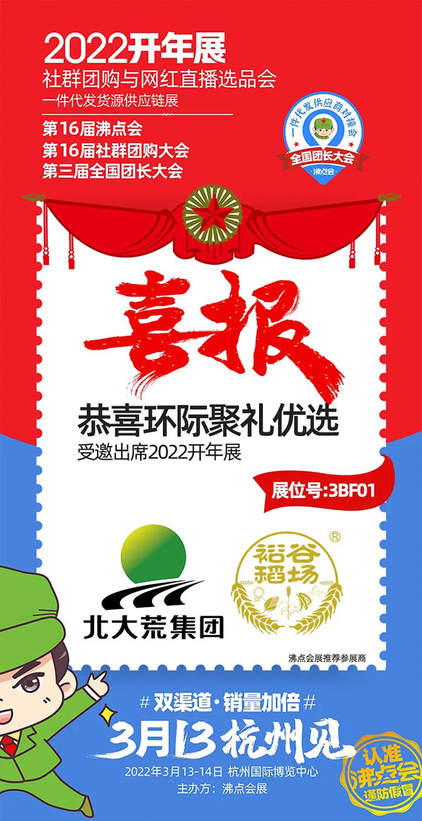 2022开年展规格高、规模大、吸引了众多王牌企业参展。所以哈尔滨环际聚礼优选科技有限公司为适应新时代发展趋势,与时具进,拓展电商新零售、团购、直播等新渠道,诚挚欢迎更多优质的合作伙伴于3月13-14日前往杭州国际博览中心3BF01观临指导,共同发展,合作双赢。