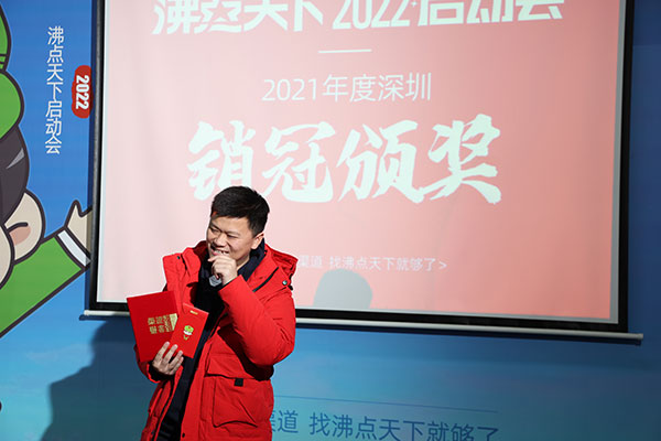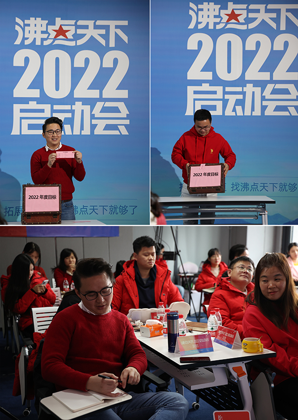 2022年2月9号,沸点天下2022启动会,在深圳隆重举办,公司领导层就公司规划,行业趋势,部门规划等做了发布;邀请了2021年度优秀同事做了经验分享;会上还举办了2021年度深圳销售冠军以及2021年深圳新人王的颁奖仪式;接着举办了仪式感满满的2022年个人目标封箱仪式。