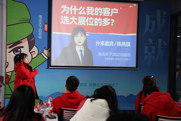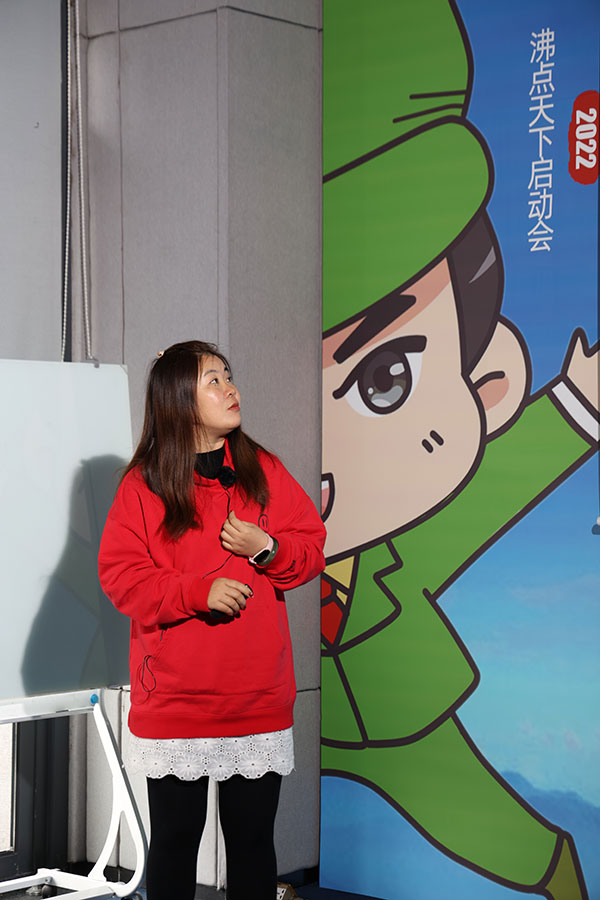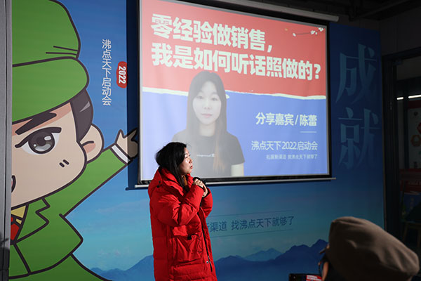 沸点天下2022启动会,陈蕾作为入职不到1年的优秀销售代表分享了她的成长经验