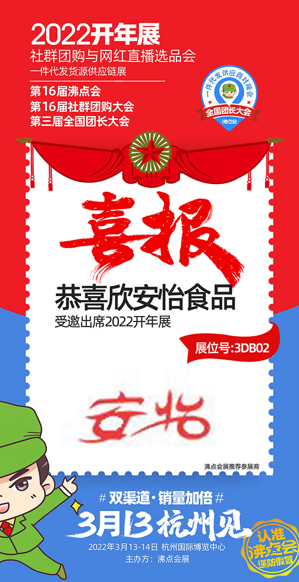 由沸点会展主办的2022开年展暨第16届沸点会(杭州)供应链展、社群团购与直播选品会、第三届全国团长大会&一件代发货源对接会系列活动将于3月13-14日在杭州国际博览中心隆重举办,聚焦双渠道、销量增长加倍。届时,重庆欣安怡食品有限责任公司受邀参展。