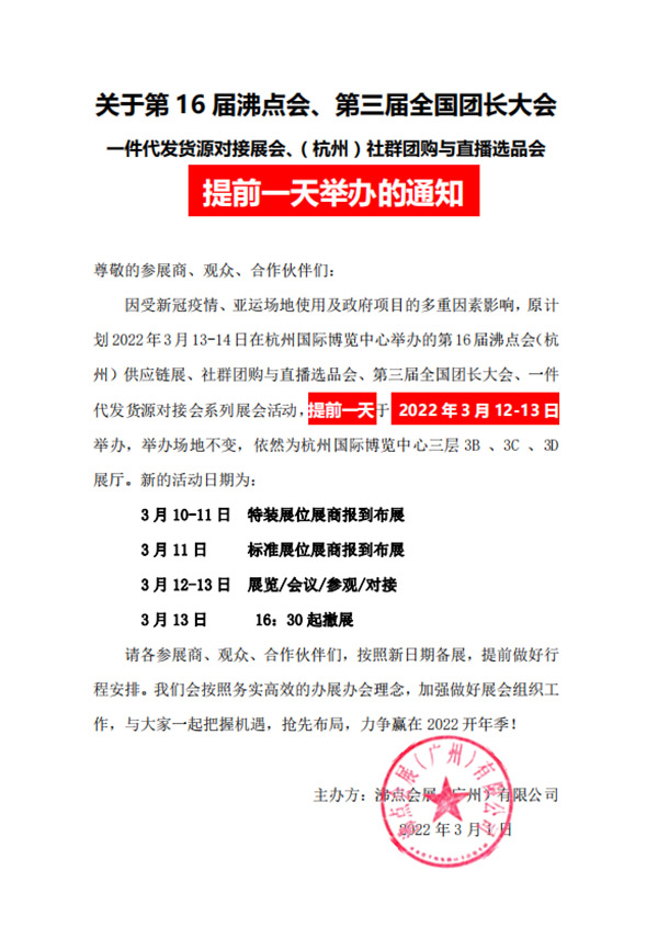 因受新冠疫情、亚运场地使用及政府项目的多重因素影响,原计划2022年3月13-14日在杭州国际博览中心举办的第16届沸点会(杭州)供应链展、社群团购与直播选品会、第三届全国团长大会、一件代发货源对接会系列展会活动,提前一天于 2022年3月12-13日举办,举办场地不变,依然为杭州国际博览中心三层3B 、3C 、3D展厅。新的活动日期为: