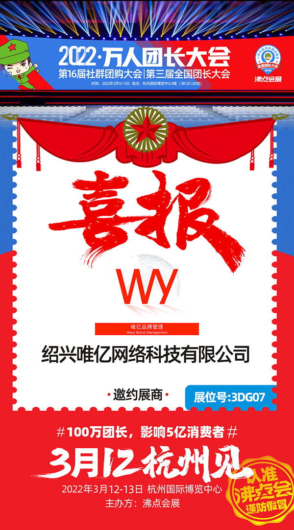 于2022年3月12-13号在杭州国际博览中心举办的杭州全国团长大会,一件代发货源对接会,展位面积30000平米,展商数量800+,新品爆品10000+,渠道方1000+,行业观众10000+,目前正在进行展位招募,绍兴唯亿网络科技有限公司强势入驻本次展会。