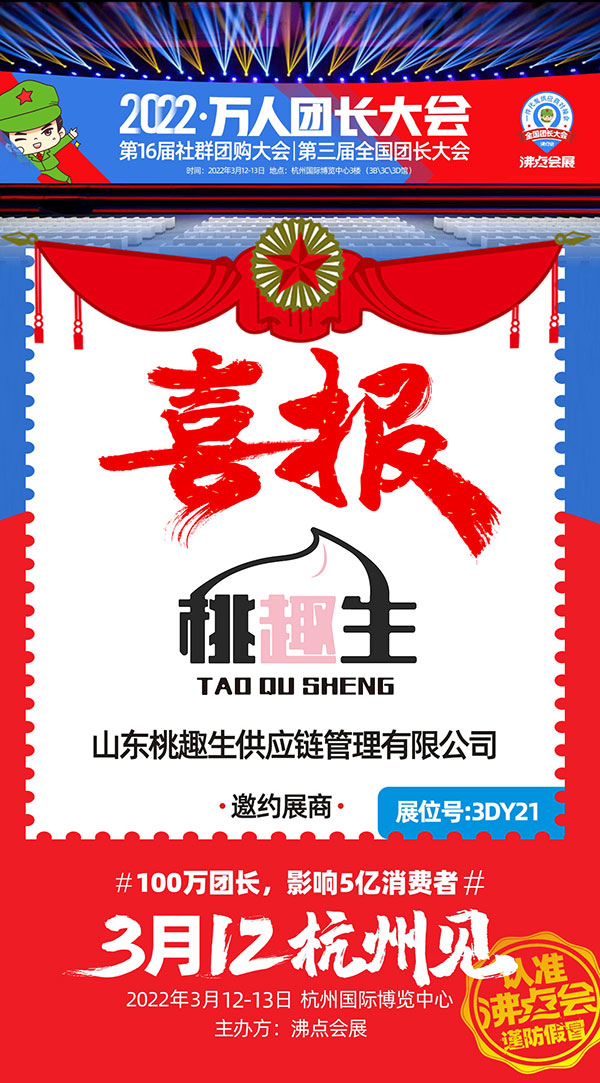 第16届社群团购大会暨2022杭州团长大会将于2022年3月12-13日,在杭州国际博览中心举办!此活动展位面积30000平米,展商数量800+,新品爆品10000+,渠道方1000+,行业观众10000+。如此盛典,山东桃趣生供应链管理有限公司受邀参展!