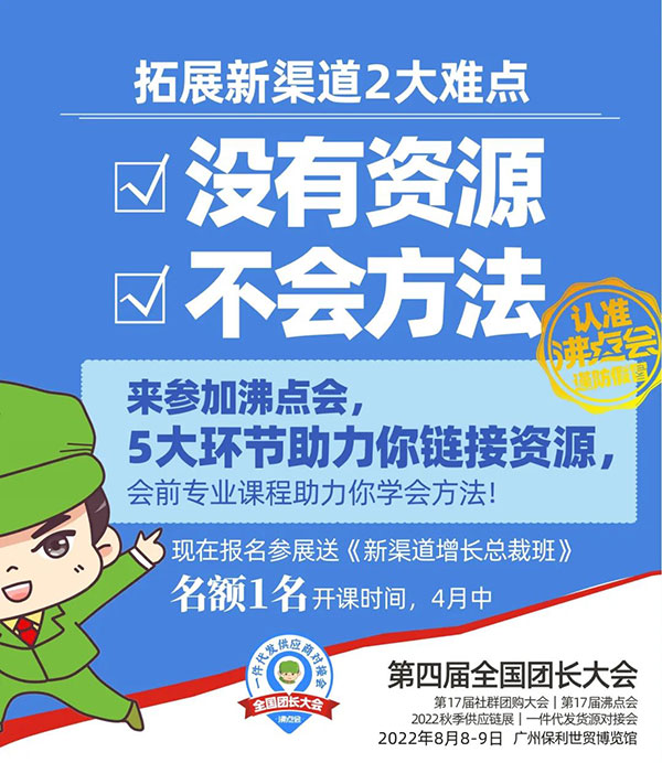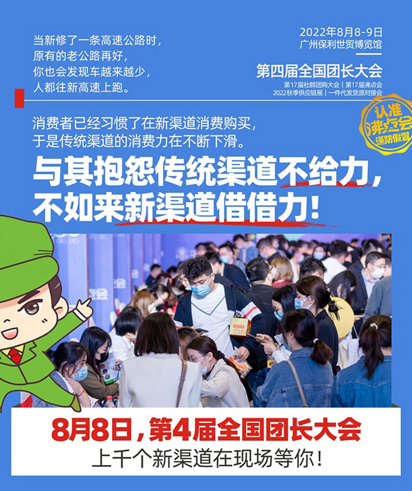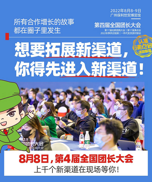沸点会展负责人姜山说:当下,是传统渠道向新渠道转换关键节点,很多传统企业都已经意识到这一点。从各种数据来看,各个工具平台的团长增长也是非常猛,所以8月8号的广州会,将是更大规模的一次展会,供货商会更多,渠道方,团长也会更多,将会是有史以来最大规模的一次全国团长大会。
