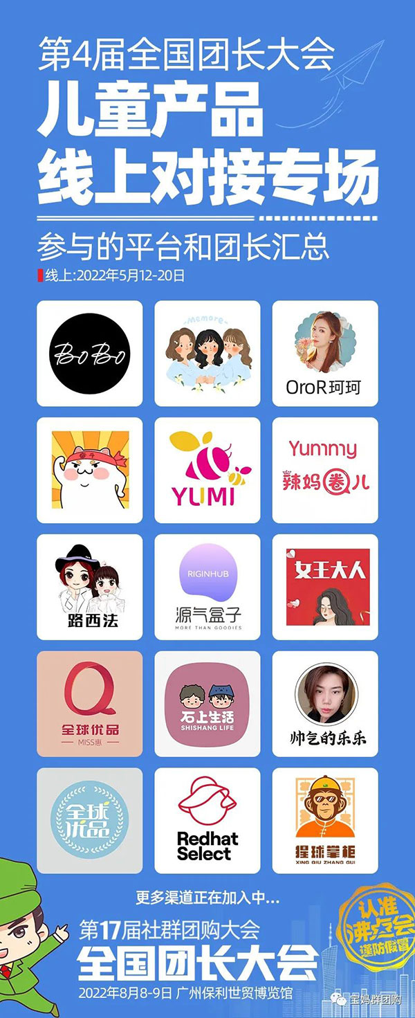 第4届全国团长大会将于8月8号在广州保利世贸展览馆举办,为助力企业把握61儿童节这个儿童产品消费节点,以及助力企业把握夏天换季这个需求高峰,沸点会展特为第4届全国团长大会的展商开设了儿童产品线上选品专场。目前已经有超多快团团大团长报名参加了!