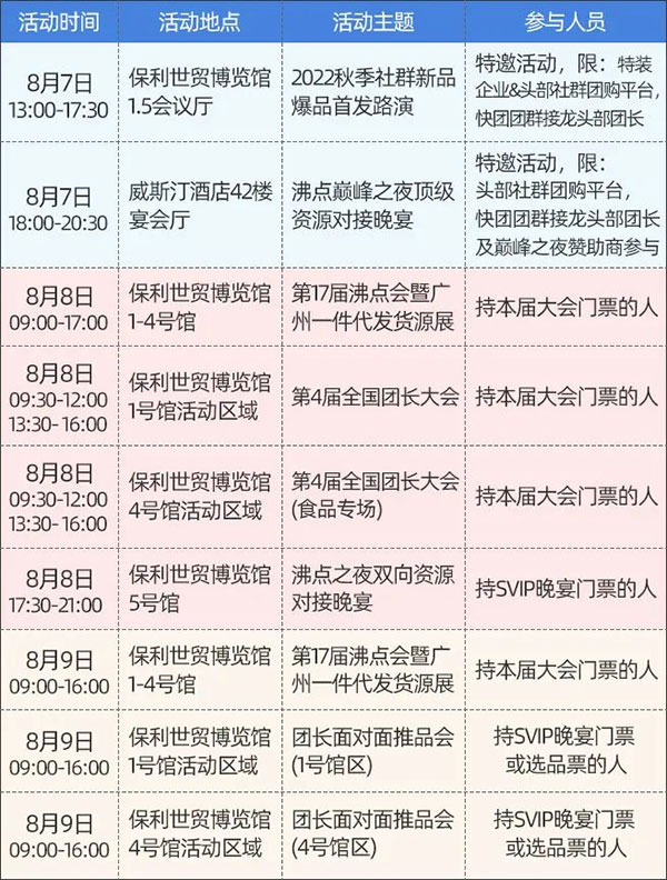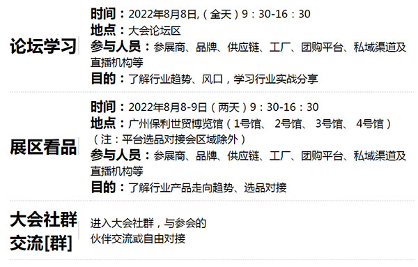 一件代发货源展;2022年秋季社群新品爆品首发路演;沸点之夜资源对接晚宴;新渠道新趋势论坛;渠道反向选品对接会;五大维度链接合作机会更多!