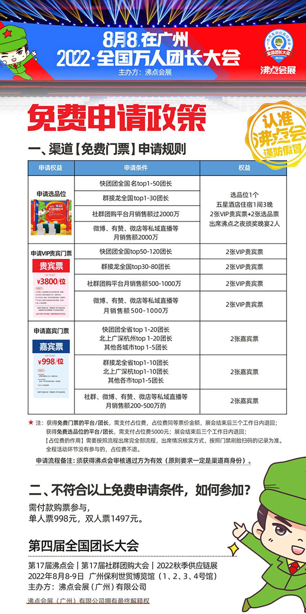 看看你身边是否有符合免费申请条件的团长(有排名的大团长),问问他们是否申请了门票,让他们帮你多申请一张,你跟他一起来!