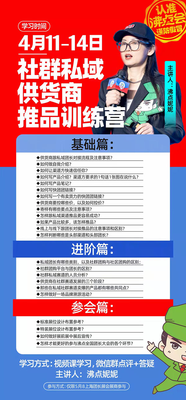 4月沸点会将针对5月8私域电商大会展商有一场线上的推品培训,教行业认知,教对接方法,教素材准备,课程表流出后,很多供货商反馈:这就是我们想要的!
