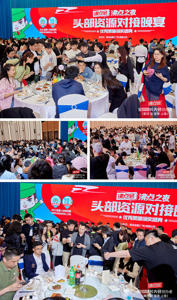 上海团长大会的沸点之夜资源对接晚宴共计162桌,放眼望去整个会场有都是交流链接,整个会场热气腾腾。