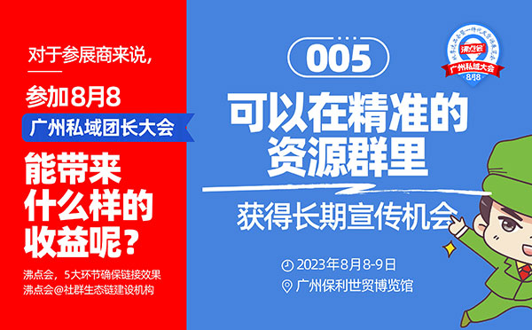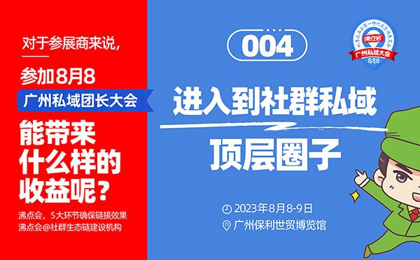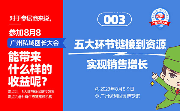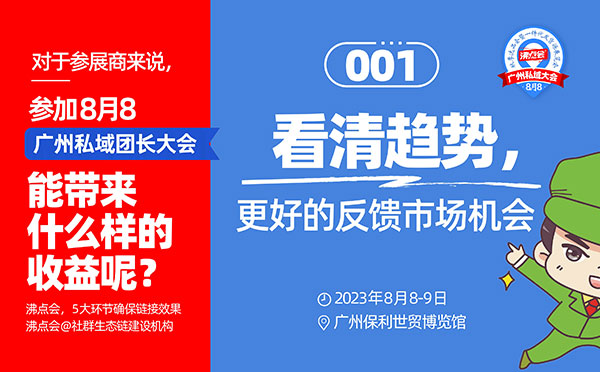 由沸点会展举办的8月8广州私域团长大会将于2023年8月8-9日在广州保利世贸博览会隆重举行,本届展会将有6个馆,展览面积超6万平,对整个私域,社群领域都将有非常大的推动作用;同时对于社会,“会展经济就是通过举办会议和展览,带来直接或间接经济效益和社会效益的经济现象和经济行为。”那么,对于参展商来说,参加参加8月8广州私域团长大会能带来什么样的收益呢?