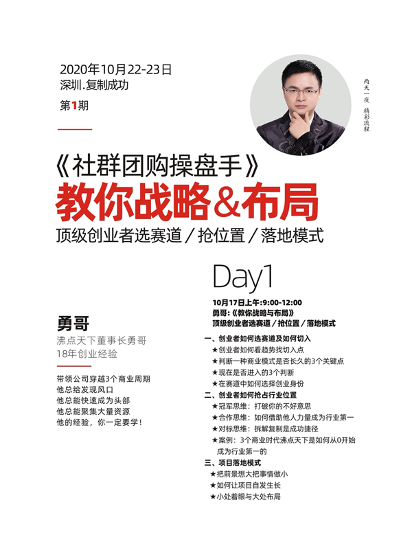 由沸点天下董事长勇哥主讲,他带领沸点天下经历了互联网,微商和社群团购3个时代,并且每个时代都能够成为行业前列,聚集大批资源。无论是赛道的选择,还是行业生态位的选择,勇哥的分享会给大家当下的创业指明方向。