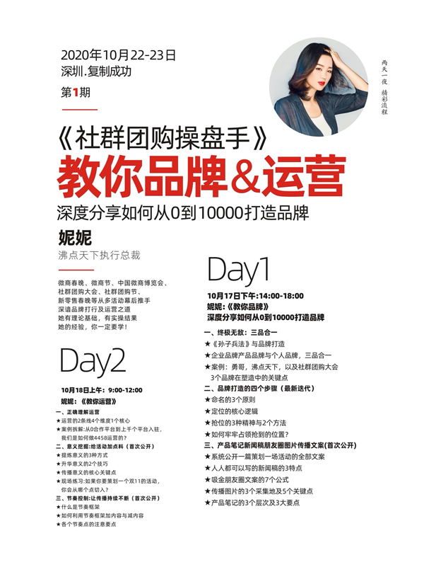 由沸点天下执行总裁妮妮主讲,妮妮是沸点天下多个项目的幕后总策划,从微商春晚到微商节,从中国微商博览会,到10届社群团购大会,从518社群团购节到社群团购供应链展,都是她的案例。这次妮妮将首次站出来为大家分享品牌与运营的相关经验,对于所有的社群团购创业者而言,这是非常好的学习与成长机会。