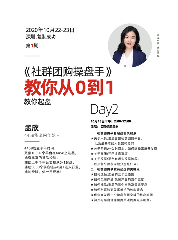 4458货源网是社群团购领域对接平台最多的货源平台,而4458货源网创始人孟欣也是被行业里称为是陪跑过最多平台起盘,供货商起盘的人,所以当沸点天下计划做社群团购操盘手课程时,孟欣就成了首选讲从0到1版块的那个人。