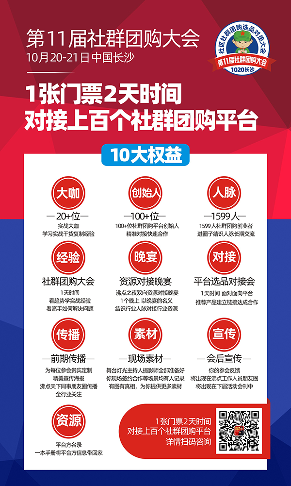 由沸点天下举办的第11届社群团购大会于10月20-21日中国长沙,1张门票2天时间对接上百个社群团购平台的机会,你应该把握!