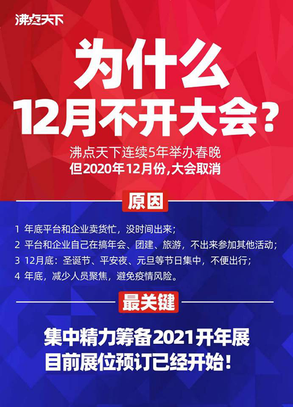 沸点天下连续5年办春晚,今年正当所有人都期待下届活动通知时,沸点天下董事长勇哥微信最新消息称:今年12月不开大会。信息称:“让客户专心做好消费旺季筹备,公司内部团建,减少人员聚集,避免疫情风险。”