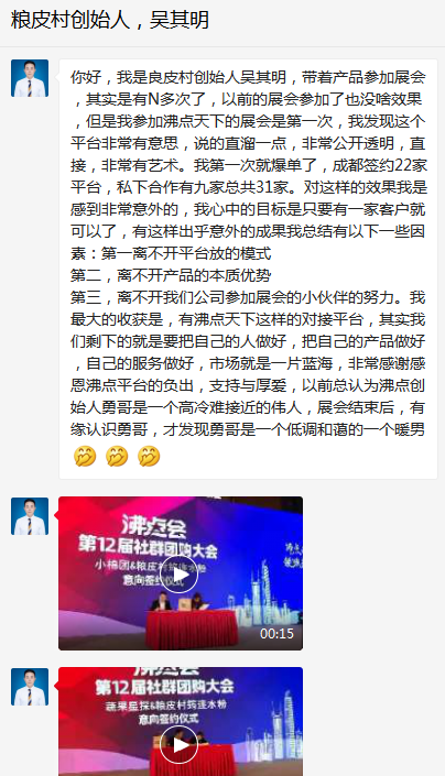 你好,我是粮皮村创始人吴其明,带着产品参加展会,其实是有N多次了,以前的展会参加了也没啥效果,但是我参加沸点天下的展会是第一次,我发现这个平台非常有意思,说的直溜一点,非常公开透明,直接,非常有艺术。我第一次就爆单了,成功签约22家平台,私下合作有九家总共31家。对这样的效果我是感到非常意外的,我心中的目标是只要有一家客户就可以了,有这样出乎意外的成果我总结有以下一些因素: