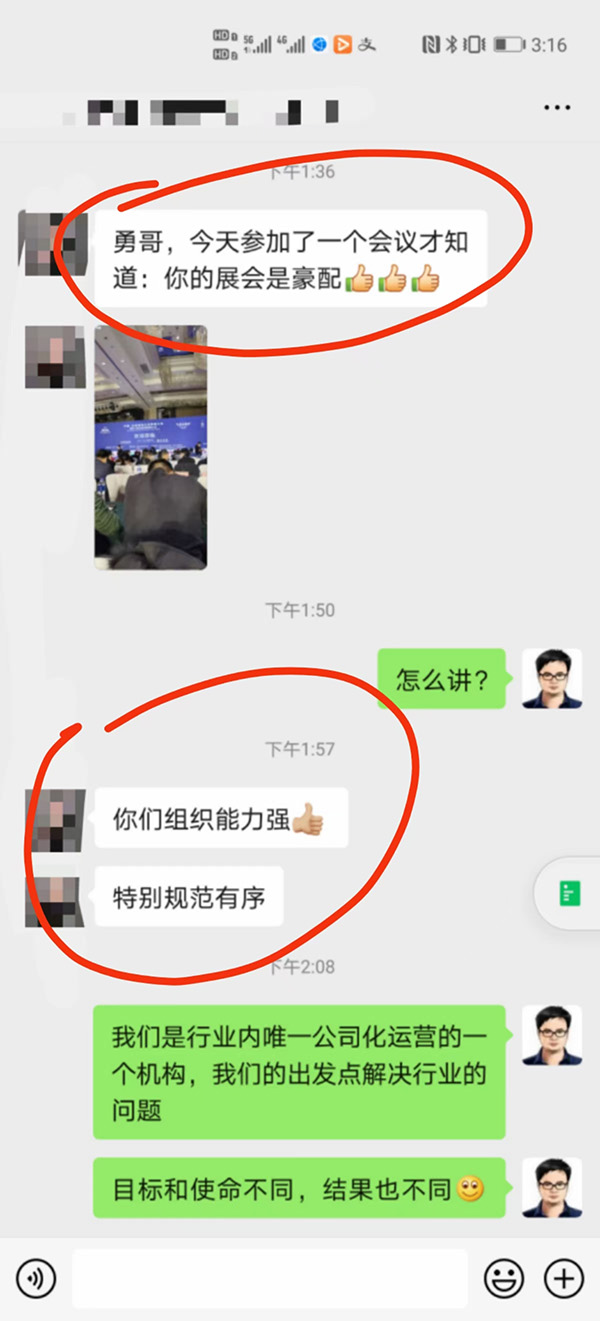 很多参加过我们沸点天下活动的客户,在参加完其他活动后都跟我们发信息:勇哥,今天参加了一个会议才知道,你的展会是豪配。你们你们组织能力强,特别规范有序。