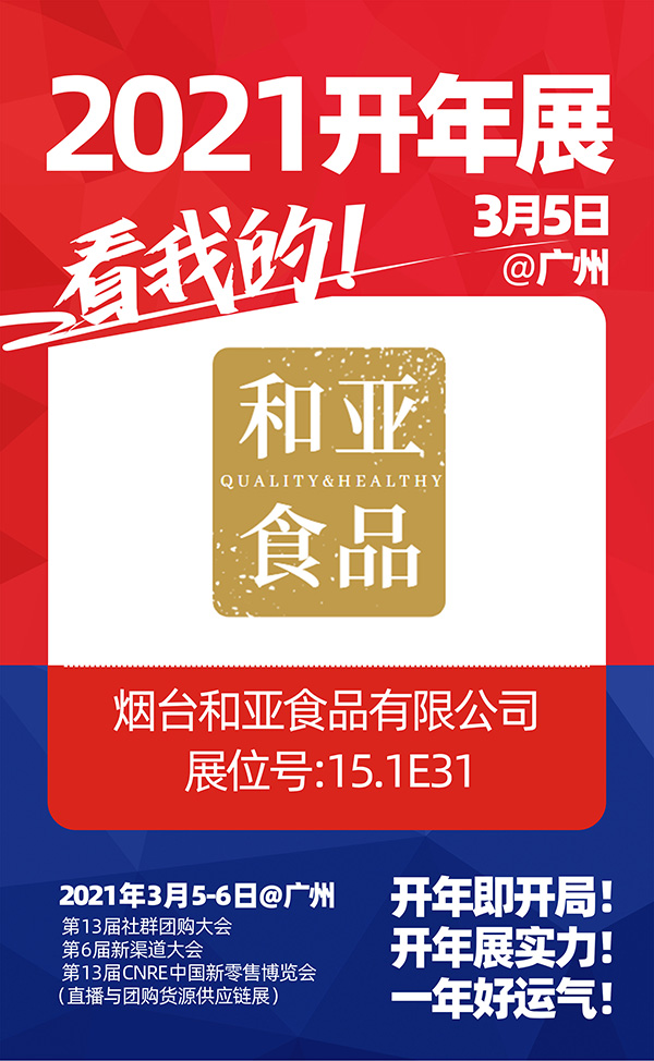 由沸点天下举办,沸点会展和4458联合承办的2021开年展暨第13届社群团购供应链展将于2021年3月5-6号在广州广交会馆举办。这次展会以【新渠道,新机遇,新增长】为主题,旨在让更供货商快速对接新渠道,获得更增长,烟台和亚食品有限公司将受邀出席本次展会。