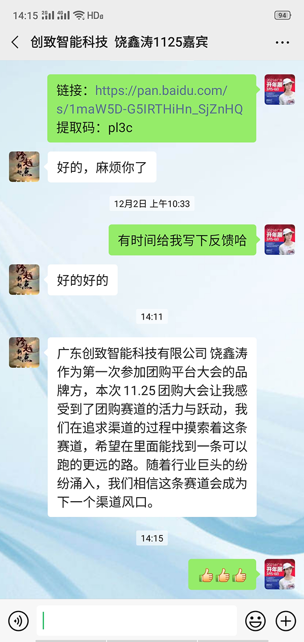 @创致智能科技 饶鑫涛:作为第一次参加社群团购平台大会的品牌方,本次11.25团购大会让我感受到了团购赛道的活力与跃动,我们在追求渠道的过程中摸索着这条赛道,希望在里面能找到一条可以跑的更远的路。随着行业巨头的纷纷涌入,我们相信这条赛道会成为下一个渠道风口。