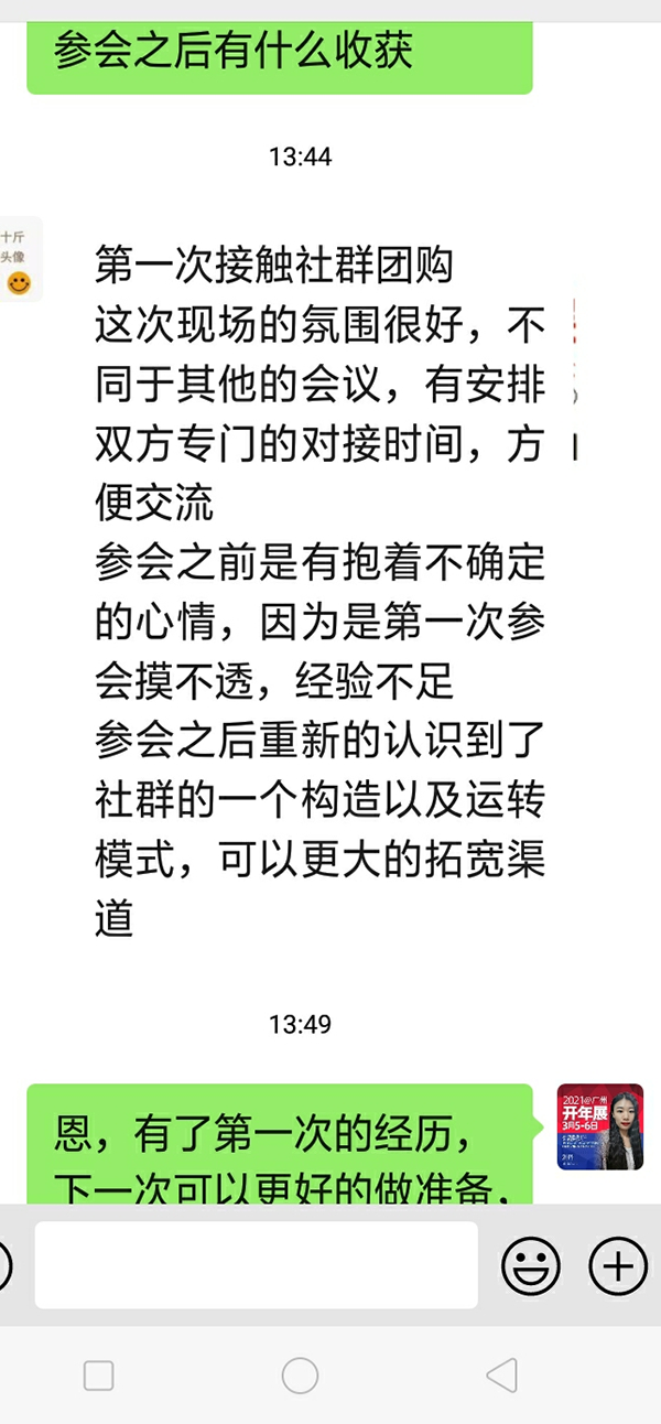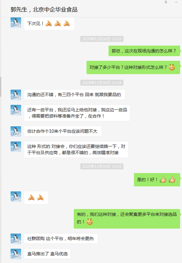 @北京中企华业食品郭先生:沟通的还不错,有三四个平台回来就跟我要品的!还有一些平台,我还没马上给他对接,得需要把资料等准备齐全了,在合作! 估计合作个10来个平台应该问题不大。这种社群团购对接会,你们应该还要继续搞一下,对于平台及供应商都是很不错的,高效精准对接。