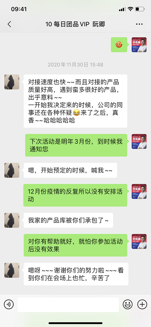 @每日团品VIP阮卿:对接速度也快~~而且对接的产品质量好高,遇到蛮多很好的产品,出乎意料~~ 一开始我决定来的时候,公司的同事还在各种怀疑来了之后,真香~~哈哈哈哈哈。
