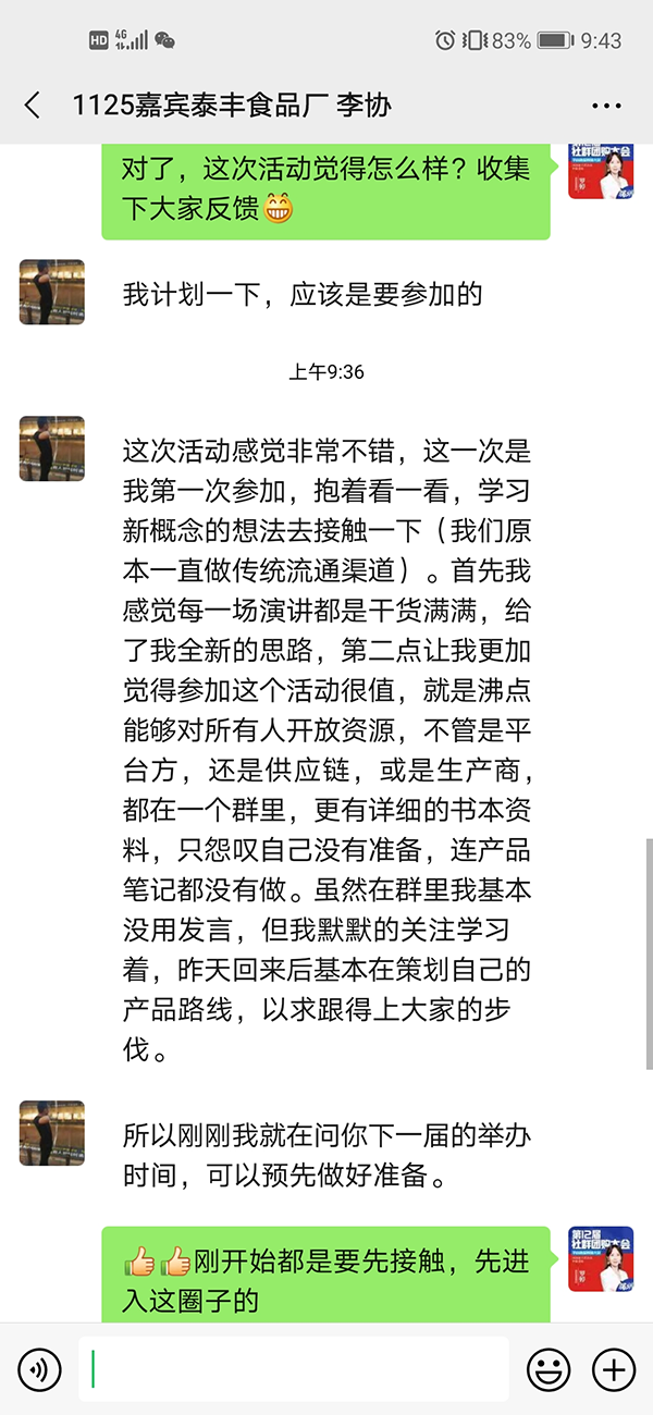 @金园泰丰食品厂李协:活动感觉非常不错,第一次来,抱着看一看,学习新概念的想法去接触(原本一直做传统流通渠道)我感觉每一场演讲都是干货满满,给我全新的思路,第二点让我更加觉得参加这个活动很值,就是沸点天下能够对所有人开放资源,很多资源都在一个群里,更有详细的书本资料。