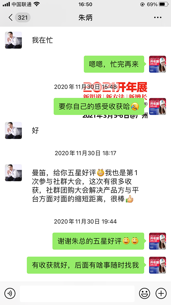 @朱炳:曼笛,给你五星好评我也是第1次参与社群大会,这次有很多收获,社群团购大会解决产品方与平台方面对面的缩短距离,很棒。