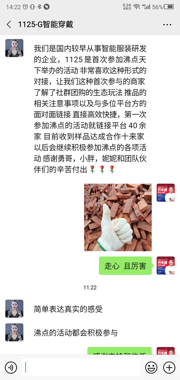 @深圳智裳科技有限公司:我们是国内较早从事智能服装研发的企业,1125是首次参加沸点天下举办的活动,非常喜欢这种形式的对接,让我们这种首次参与的商家了解了社群团购的生态玩法、推品的相关注意事项以及与多位平台方的面对面链接,直接高效快捷,第一次参加沸点的活动就链接平台40余家,目前收到样品达成合作十来家,以后会继续积极参加沸点的各项活动。感谢勇哥,小胖,妮妮和团队伙伴们的辛苦付出。