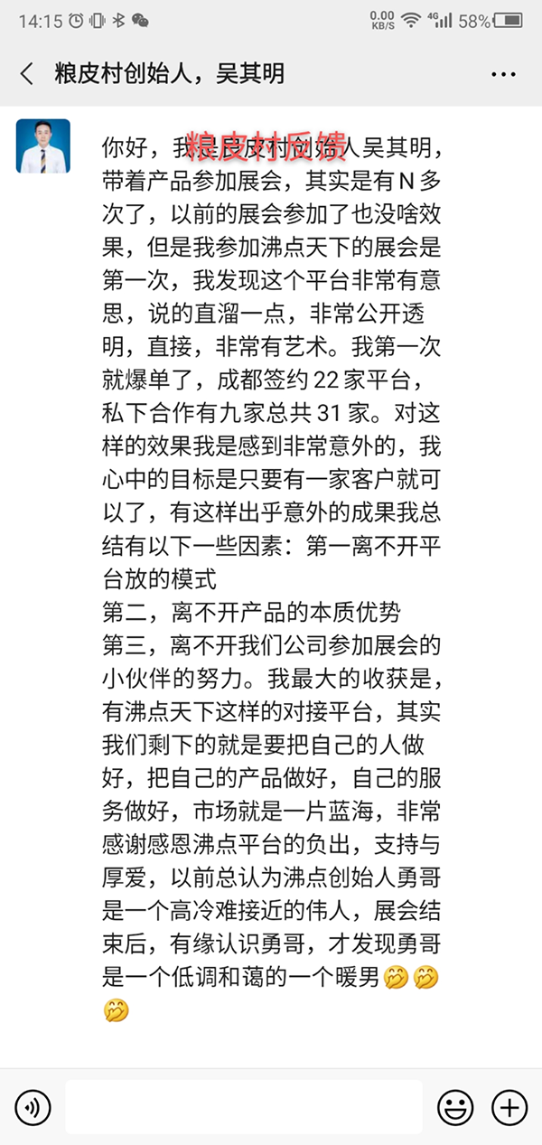 @粮皮村创始人吴其明:你好,我是粮皮村创始人吴其明,带着产品参加展会,其实是有N多次了,以前的展会参加了也没啥效果,但是我参加沸点天下的展会是第一次,我发现这个平台非常有意思,说的直溜一点,非常公开透明,直接,非常有艺术。