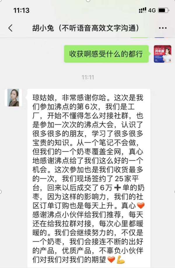 @胡小兔:琼姑娘,非常感谢你哈。这次是我们参加沸点天下的第6次,我们是工厂,开始不懂得怎么对接社群团购,也是参加一次次的沸点天下大会,认识了很多很多的朋友,学习了很多很多宝贵的知识。从一个笔记不会做,到我们的一个奶枣覆盖全网,真心地感谢沸点给了我们这么好的一个机会。