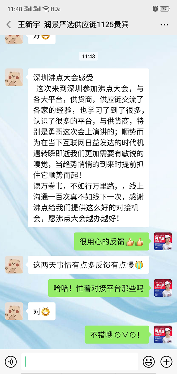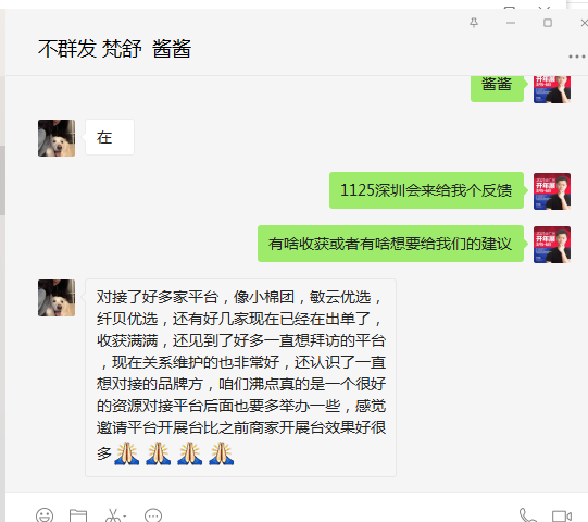 @梵舒 酱酱:对接了好多家平台,像小棉团,敏云优选,纤贝优选,还有好几家现在已经在出单了,收获满满,还见到了好多一直想拜访的平台,现在关系维护的也非常好,还认识了一直想对接的品牌方,咱们沸点天下真的是一个很好的资源对接平台后面也要多举办一些。