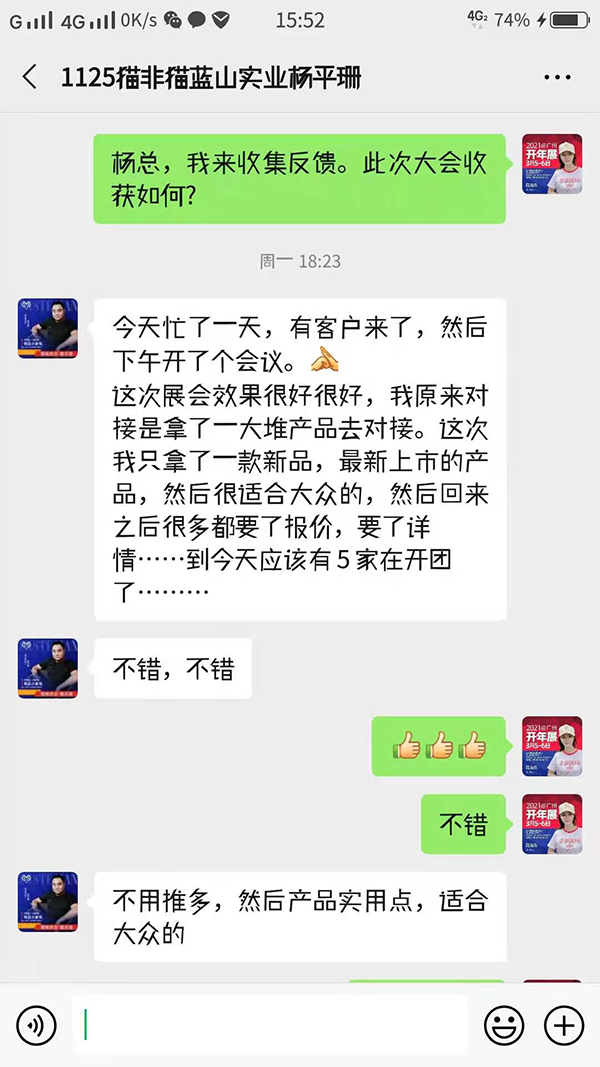 @猫非猫蓝山实业杨平珊:这次展会效果很好很好,我原来对接是拿了一大堆产品去对接,这次我只拿了一款新品,最新上市的产品,然后很适合大众的,然后回来之后很多都要了报价,要了详情,到今天应该有5家在开团了。