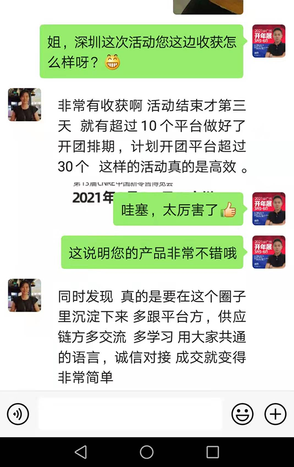 同时发现,真的要在这个圈子里沉淀下来,多跟平台方、供应链方多交流,多学习,用大家共通的语言,诚信对接,成交就变得非常简单。