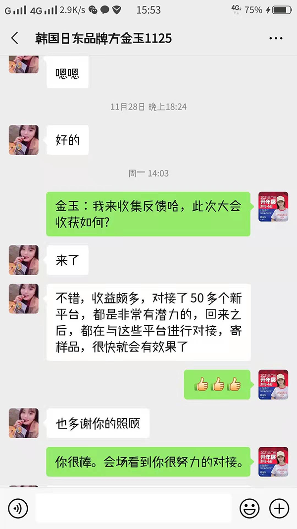 @韩国日东品牌方金玉:收益颇多,对接了50多个新平台,都是非常有潜力的,回来之后,都在与这些平台进行对接,寄样品,很快就会有效果了。
