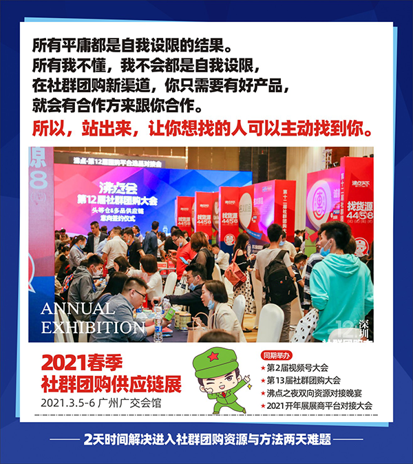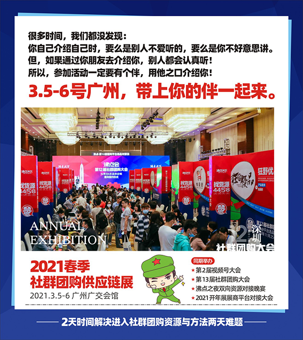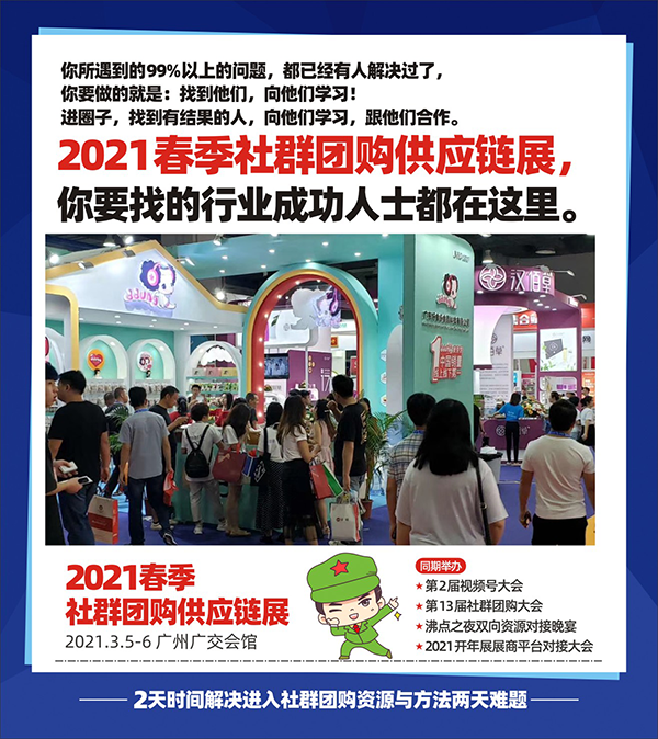 总之,2021年3月5-6号,沸点天下在广州广交会馆举办的2021春季社群团购选品会,无论是内容,规模,影响力,还是展商质量等,将是行业影响力第一的展会,对想要在2021年实现开门红的朋友们来说,来2021春季社群团购选品会一定要参加。