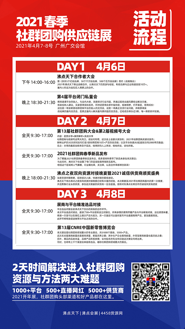 按沸点天下董事长勇哥的话说:2021春季社群团购供应链展与往届的活动相比,这一次舞台更大,到了广交会馆;时机更好,以往是我们追着客户来参展,这次展会是很多客户主动要来参加,因为大家都意识到市场在转型;这一次资源更好,头部平台都会来,新起盘的平台更是要来,视频号主也在寻找好产品变现,所以这一次的资源方也是相当不错。