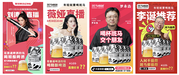 在直播混战的一年中,斑马精酿凭借优秀口感和严格的品控,征服 了一众头部主播们挑剔的选品团队。仅在2020一年间,就获得刘 涛、薇娅、罗永浩、李诞、吉杰、沈涛、张蓝心等一众明星大咖倾力 推荐,屡破同品类实时销售记录。
