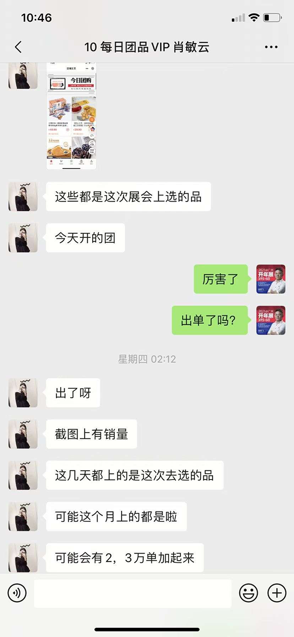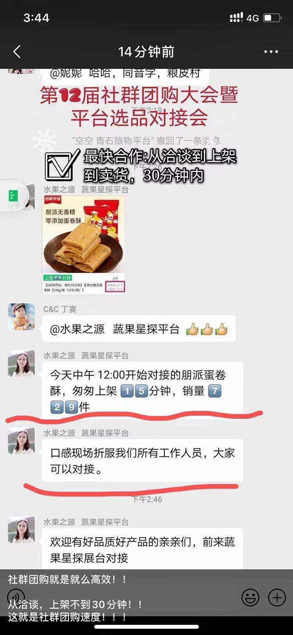 事情发生在2020年11月26号,第12届社群团购大会选品对接会现场,吉祥妈妈到了蔬果星探平台展位,由于产品资料准备得充分,并且产品样品体验得不错,蔬果星探创始人当场就决定开团,仅仅15分钟就秒杀了小1000单,双方都信心十足,谈定周三为正式开团日。