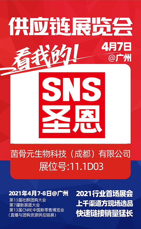 由沸点天下、沸点会展、4458货源网联合举办的“2021第七届新渠道大会(社群与直播供应链展)、第13届CNRE新零售博览会”将于2021年4月7-8日在广州广交会馆B馆举办。本次展会汇聚全国优秀的社群团购和直播供应链企业齐集广州,菌骨元生物科技(成都)有限公司即将隆重亮相2021供应链展览会。