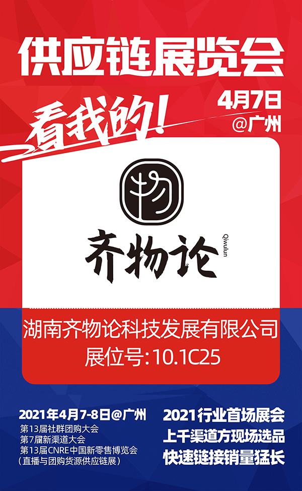 4月7-8号,2021社群团购供应链开年展,湖南齐物论科技发展有限公司与你相约广州广交会馆,不见不散,展位号:15.1C25。