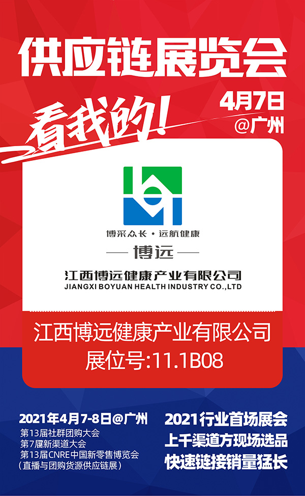 江西博远健康产业有限公司现已发展成集团化,品牌化,加入本次展会想多渠道拓展,让企业和品牌走向世界。4月7-8号,2021社群团购供应链开年展,江西博远健康产业有限公司与你相约广州广交会馆,不见不散!