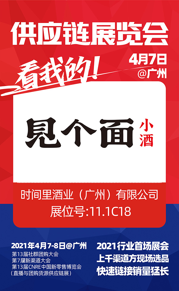 由沸点天下、沸点会展、4458货源网联合举办的“2021第七届新渠道大会(社群与直播供应链展)、第13届CNRE新零售博览会”,参展商和平台方都在踊跃报名中,时间里酒业(广州)有限公司(以下简称“见个面小酒”)受邀参展2021社群团购供应链开年展!